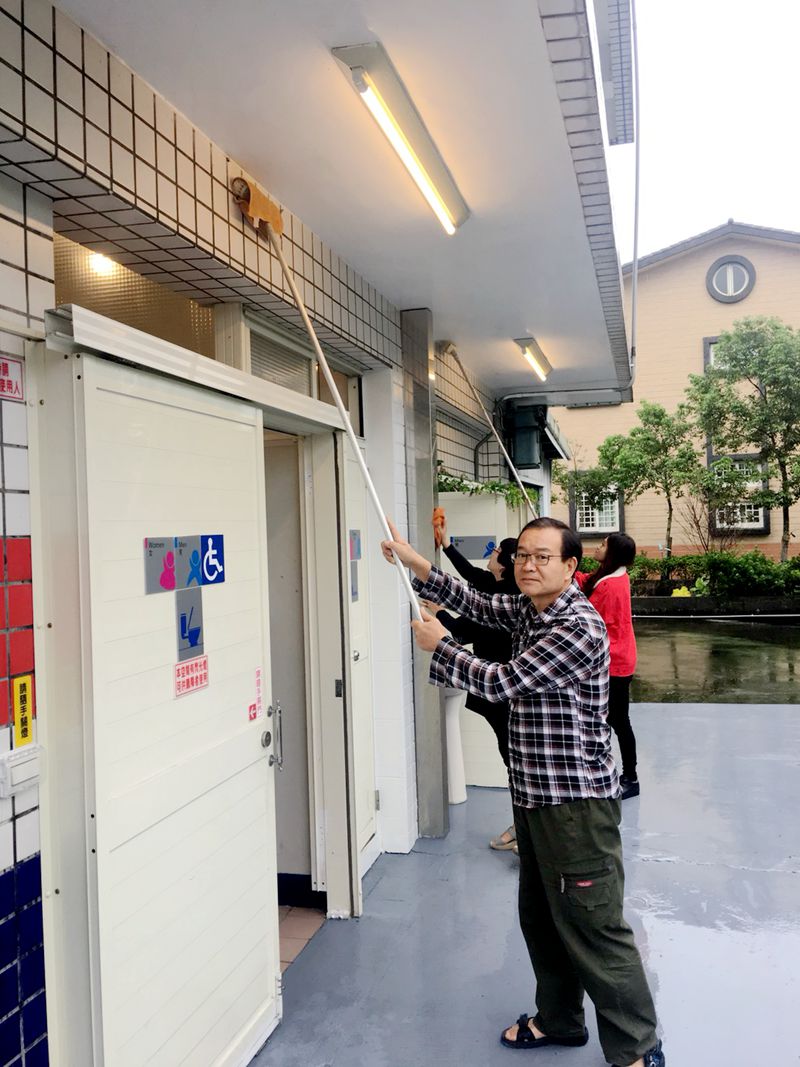 最近陳縣長要求加強公共廁所清潔,陳正松和吳美容在廁所內提供衛生紙,洗手乳,烘手機(可減少擦手紙,也減少髒亂點)。還掛上油畫,盆栽,兩人和員工一起擦拭廁所內牆壁、天花板,每小時檢查廁所。
