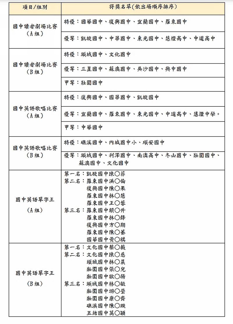 宜蘭縣 110 學年度國民中小學 English Easy Go 系列活動,比賽結果,成績如下:
