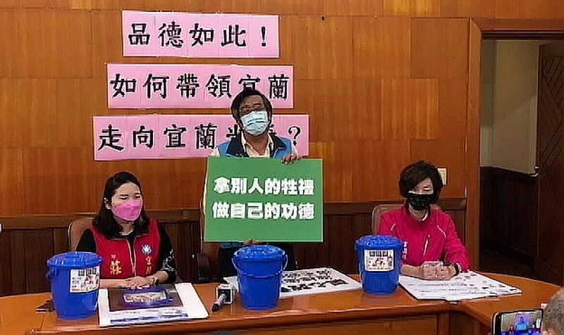 楊弘旻議員說,宜蘭市的厨餘桶貼著江聰淵市長的廣告,冬山的沒有貼,看起來就像是市長送的,這就是「拿別人的牲禮.做自己的功德」,誤導民眾這些都是他做的,選舉不要選成這樣。