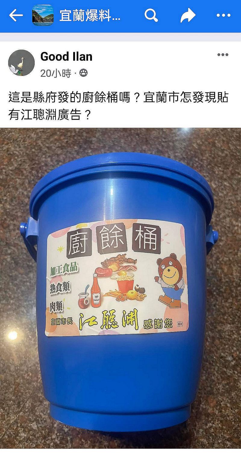 莊議員說,她在在宜蘭爆料公社臉書看到貼文「這是縣府發的廚餘桶嗎?宜蘭市怎發現貼有江聰淵廣告?」