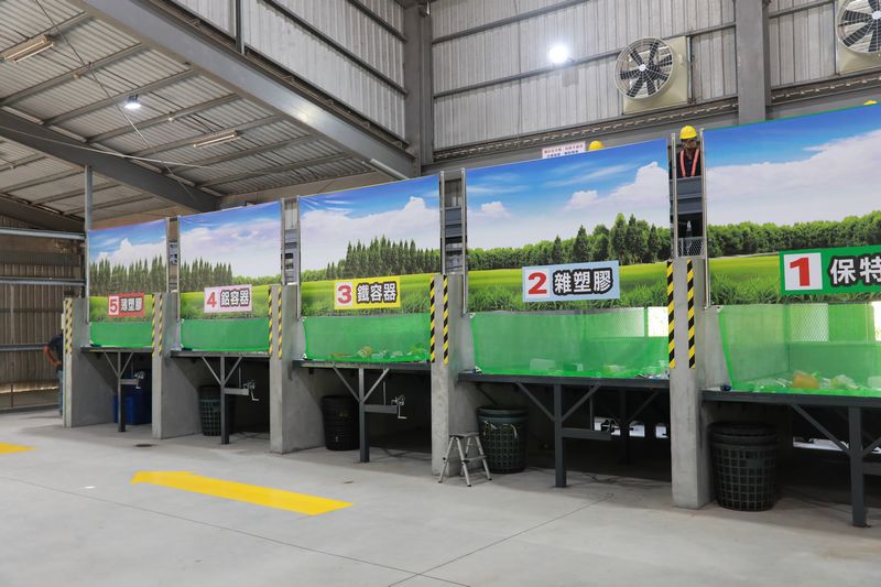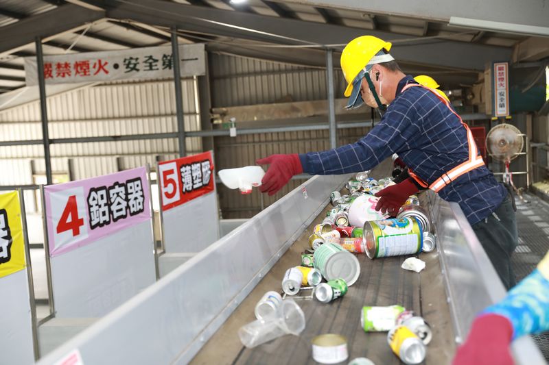 新設置的輸送帶分為上下兩層,收集回來的回收物倒入進料口後,會送到上層輸送帶,經過材質分類區域,分別撿出寶特瓶、雜塑膠、鐵鋁容器及薄塑膠等各種類的材質,最後廢料則送到輸送帶末端收集載走。當下方的儲存槽裝滿時,上層輸送帶會停止運作,儲存槽閘門打開,將分類好的回收物由下層輸送帶送到末端,交給山貓車搬至貯存區存放。