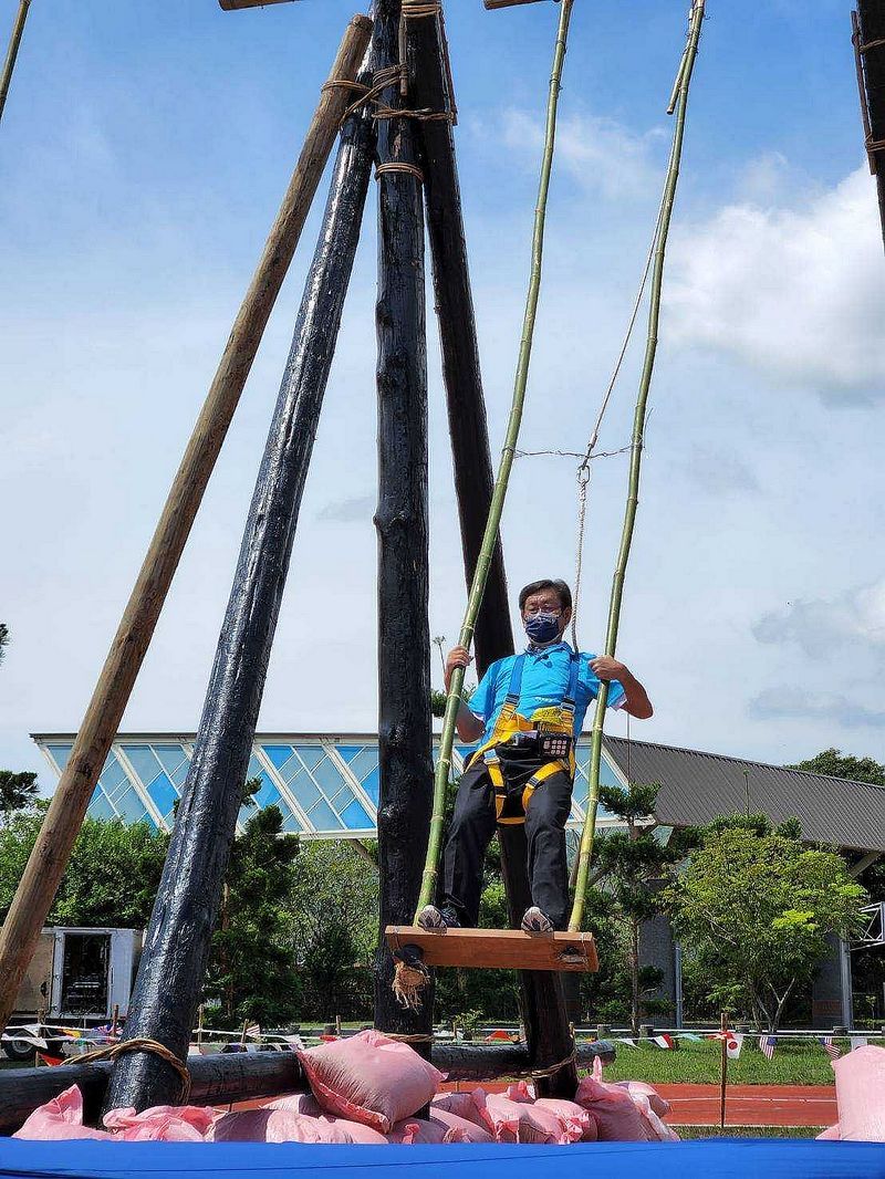 傳承132年歷史的中秋月圓盪鞦韆,整個搭建沒有用任何一根釘子,已經成為舉得的技藝,礁溪鄉公所特別邀請109年冠軍曾上泰、第8名林裕強及第10名陳大右等選手試盪,分享盪鞦韆的訣竅。上述這3位選手都會參加今年社會公開組比賽,精彩可期。