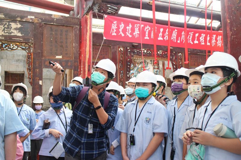「宜蘭五穀廟」為宜蘭縣主祀神農大帝歷史最為悠久的廟宇,於105年登錄為歷史建築後,縣府旋即與廟方共同研商新、舊廟並存的最佳方案,並啟動新廟興建與舊廟修復。今(24)日舊廟修復工程已達「上梁」階段,文化局為推動文資保存與在地歷史文化教育,特別邀請宜蘭市復興國中師生到場參與,共同見證「宜蘭五穀廟」的歷史發展及修復軌跡。