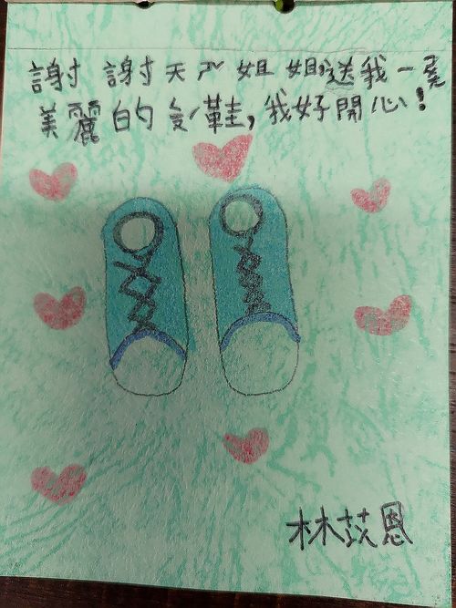 二年級同學自己做了一張小卡片,上面畫了充滿愛心的圖案,和一雙漂亮的鞋,上面寫著:「謝謝天使姊姊送我一雙美麗的球鞋,我很開心」。五年忠班則以「美麗的印記」為題,謝謝美麗的天使姐姐,送我們美麗的鞋。