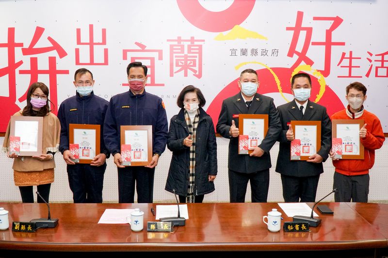 宜蘭縣林姿妙縣長今(20)日在縣務會議中,頒獎表揚111年縣政府廉能事蹟人員。這次獲獎人員分別為~教育處科員吳俐萱、消防局宜蘭分隊陳逸凡分隊長、消防局礁溪分隊陳銘基分隊長、警察局澳花派出所胡傳明所長、警察局明池派出所蘇明勝所長、宜蘭市光復國小林進順組長等6人,分別獲頒獎狀乙幀,獎金二千元。