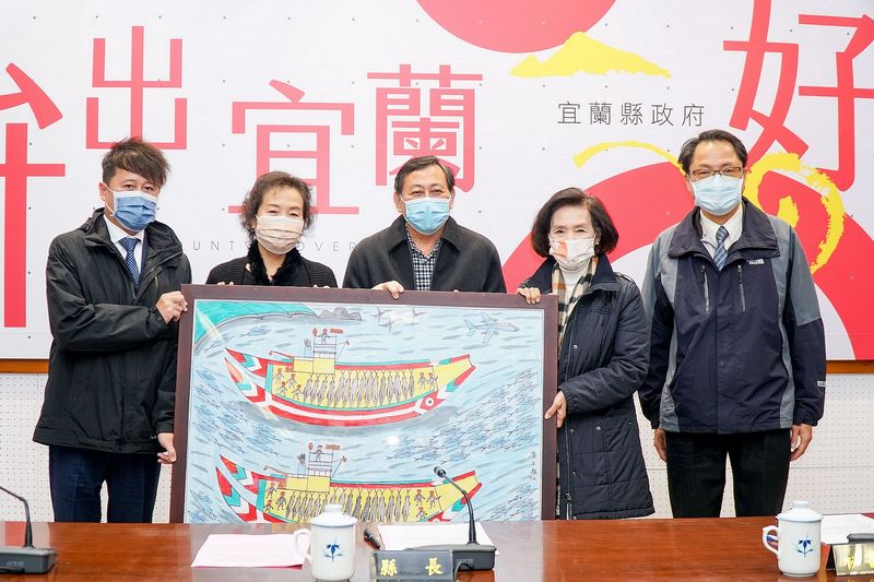 育英國小主任劉文正(左1)贈送爺爺「東澳灣捕魚大豐收」的畫作給予宜蘭縣長林姿妙