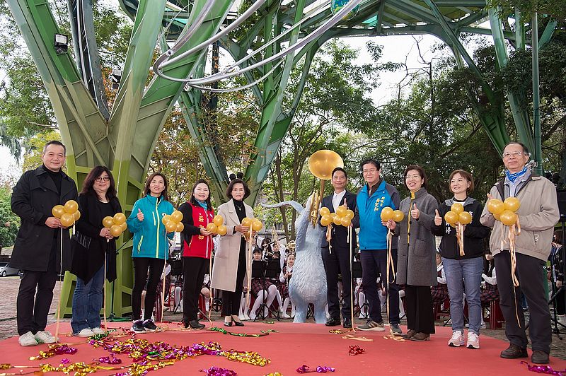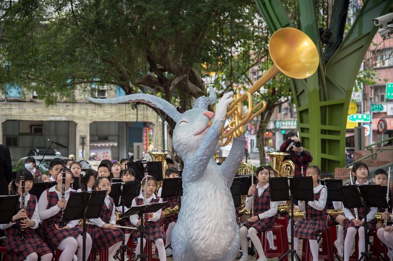 林姿妙縣長今天貴賓為「飛天小火車」2.0版揭幕啟用,宜蘭市新生國小管樂團演奏磅礡的音樂曲目,與廣場上新增毛毛兔吹奏樂器等藝術裝置相映,形成童趣可愛的互動畫面,療癒現場的嘉賓與民眾,一同感受到歡樂過新年的氣氛。