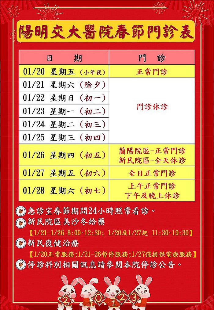 除★急診全天候提供24小時急診專科主治醫師為民眾服務不打烊外,美沙冬給藥及復健治療也提供了部份服務時段,★1/26初五(星期四)蘭陽院區即恢復正常門診,新民院區於★1/27初六(星期五)開始提供門診服務。