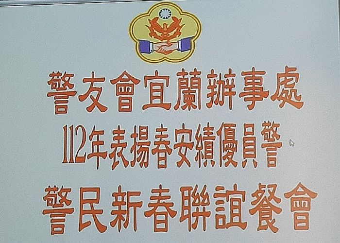宜蘭縣警察之友會宜蘭辦事處今天15日舉辦~春安績優員警表揚暨警民新春聯誼,在宜蘭市千藝餐廳舉行,表揚由宜蘭警察分局遴選的各派出所等單位績優員警,每人頒發「忠勤奮勉」獎牌一面與獎金祝賀。