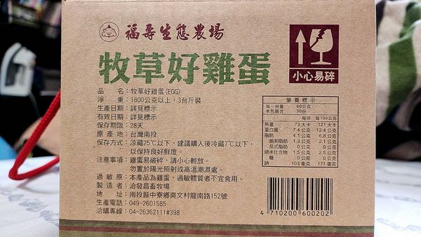 雞蛋盒上並印著「福壽生態農場」、「牧草好雞蛋」,小字印著~牧場直送、無藥物殘、新鮮純淨安全、福壽飼料源頭把關、農場嚴格控管、植物配方、使用牧草、天然健康、蛋殼斑點是自然現象、不影響品質、請安心食用。
