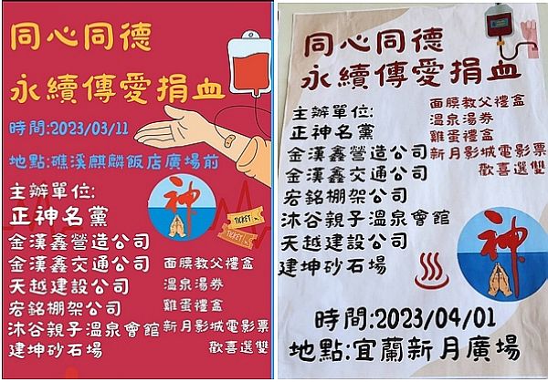 正神名黨主席許榮德表示,對於熱心捐血者,贈送的禮品有~雞蛋禮盒、面膜教父禮盒、溫泉湯券、友愛影城電影票。捐血者可以四項中選兩項。其中雞蛋禮盒每一場提供100盒,每一盒三台斤裝,約30顆,是牧草雞蛋,贈完為止;教父面膜市價一盒900多元。