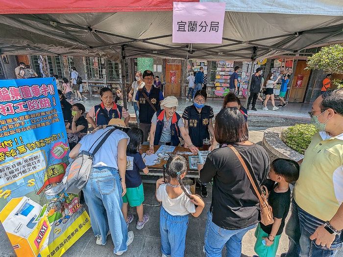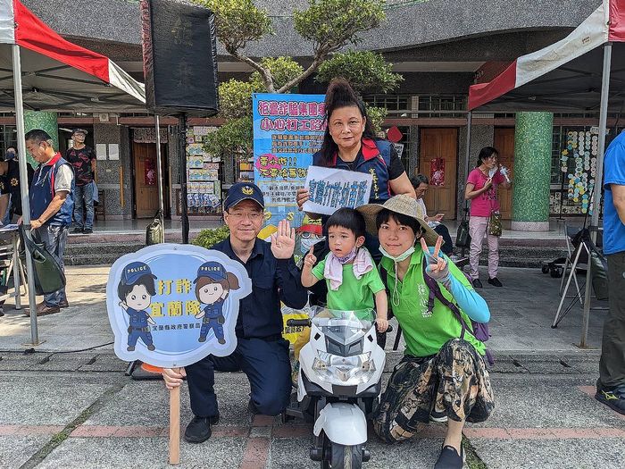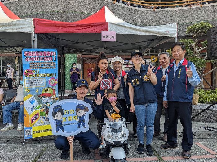 分局還特別準備了警察大頭娃娃、警用重型機車、供民眾騎乘及合照,並與宜蘭國小孩童一起成立「宜蘭打詐幼苗隊」,加強孩童從小培養「識詐」觀念,向小朋友及家長們講解近期常見的詐騙手法及案例,「打詐」「識詐」不分年紀,積極宣導希望全民一起來打詐。