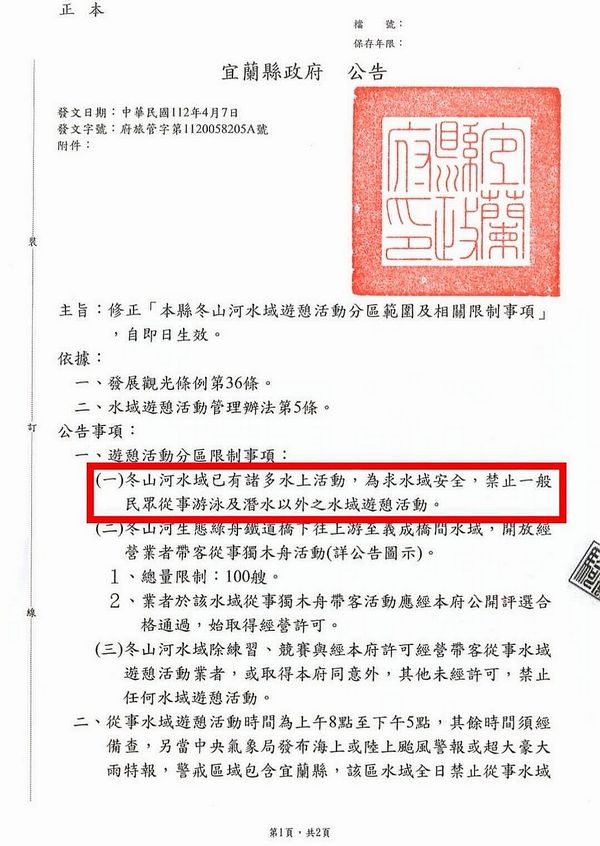 宜蘭縣政府公告~「冬山河水域已有諸多水上活動,為求水域安全,禁止一般民眾從事游泳及潛水以外之水域遊憩活動」,陳鴻禧議員質疑既然可以游泳潛水,就應該照規定配置救生員,要求審計室主任好好查一查。