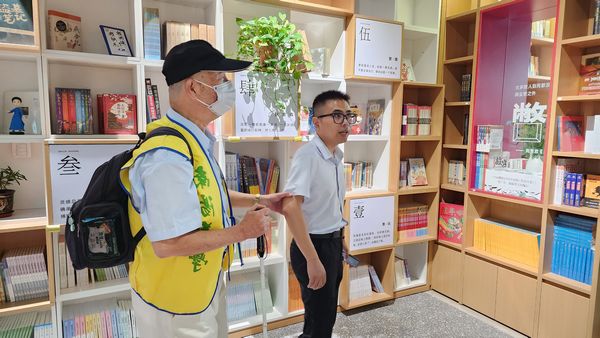 圖/南陽義學團員中有一位高度眼盲,參訪時只要趙凱鋒科長在,都一定陪同他,一路為他打前鋒,遇到階梯就提醒,有時還作解說員,貼心的照顧,許多團員都看在眼裡,對他的服務精神表示敬佩。