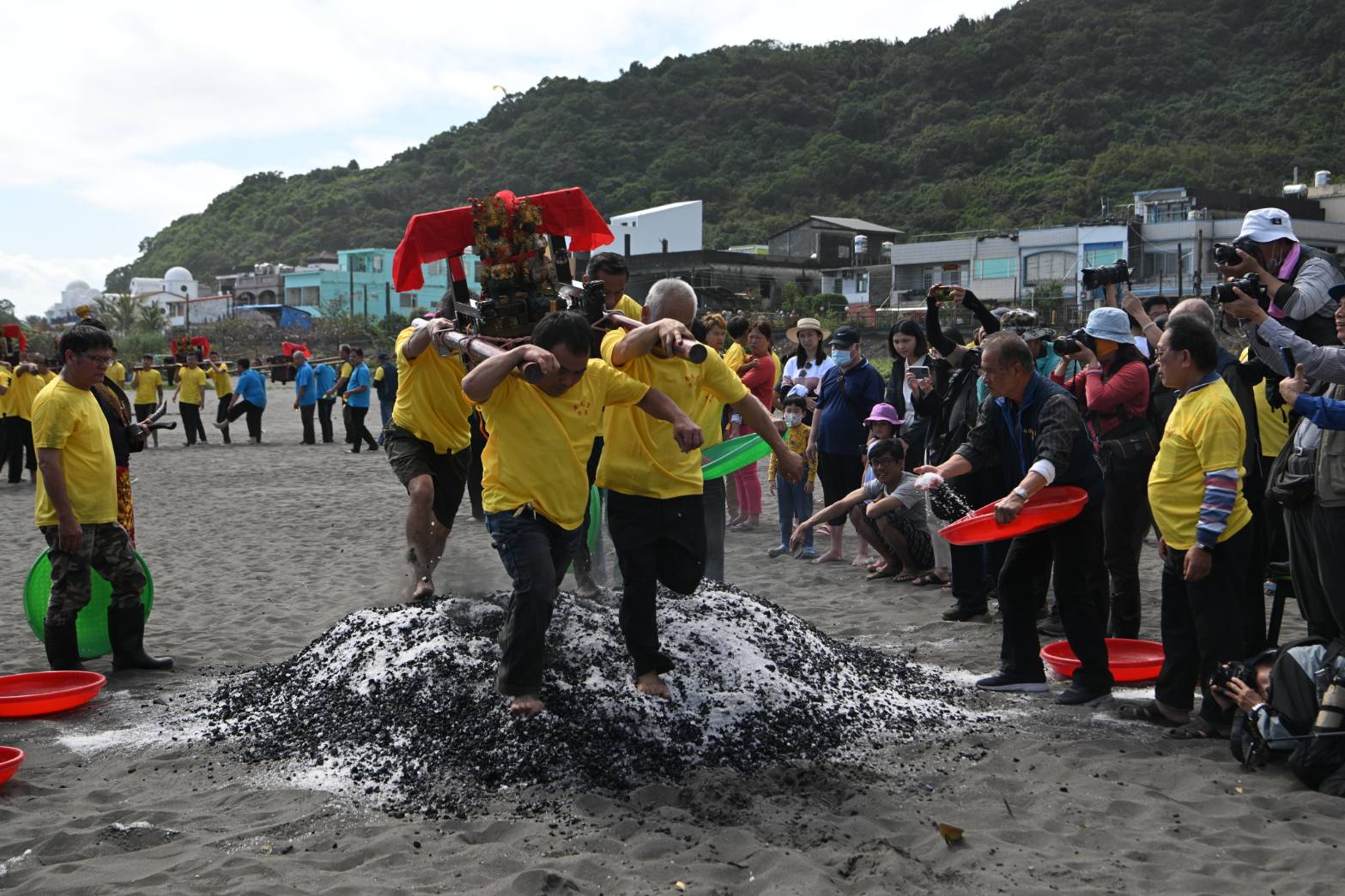 今天的活動有在岸上的「過火」、抬神轎下海,以及將神明綁在滑板上,由高手滑行。