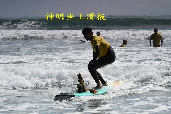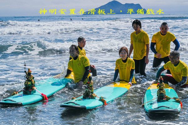 明日(初九)是天公生,宜蘭縣頭城外澳慶天宮今(17)日在外澳海邊,舉辦神明坐上衝浪板戲水的慶生活動,