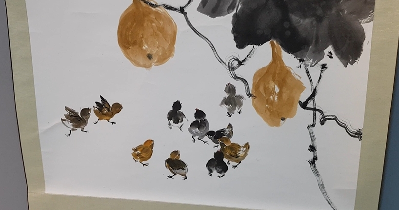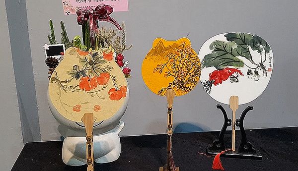 鄒老師用兩張畫,畫了一幅黃槿樹,銜接得非常好,另外也有許多畫在扇子上的小品,線條景韻,十分雅緻,鄒老師說這些小作品,好看又實用,作品完成得又快。