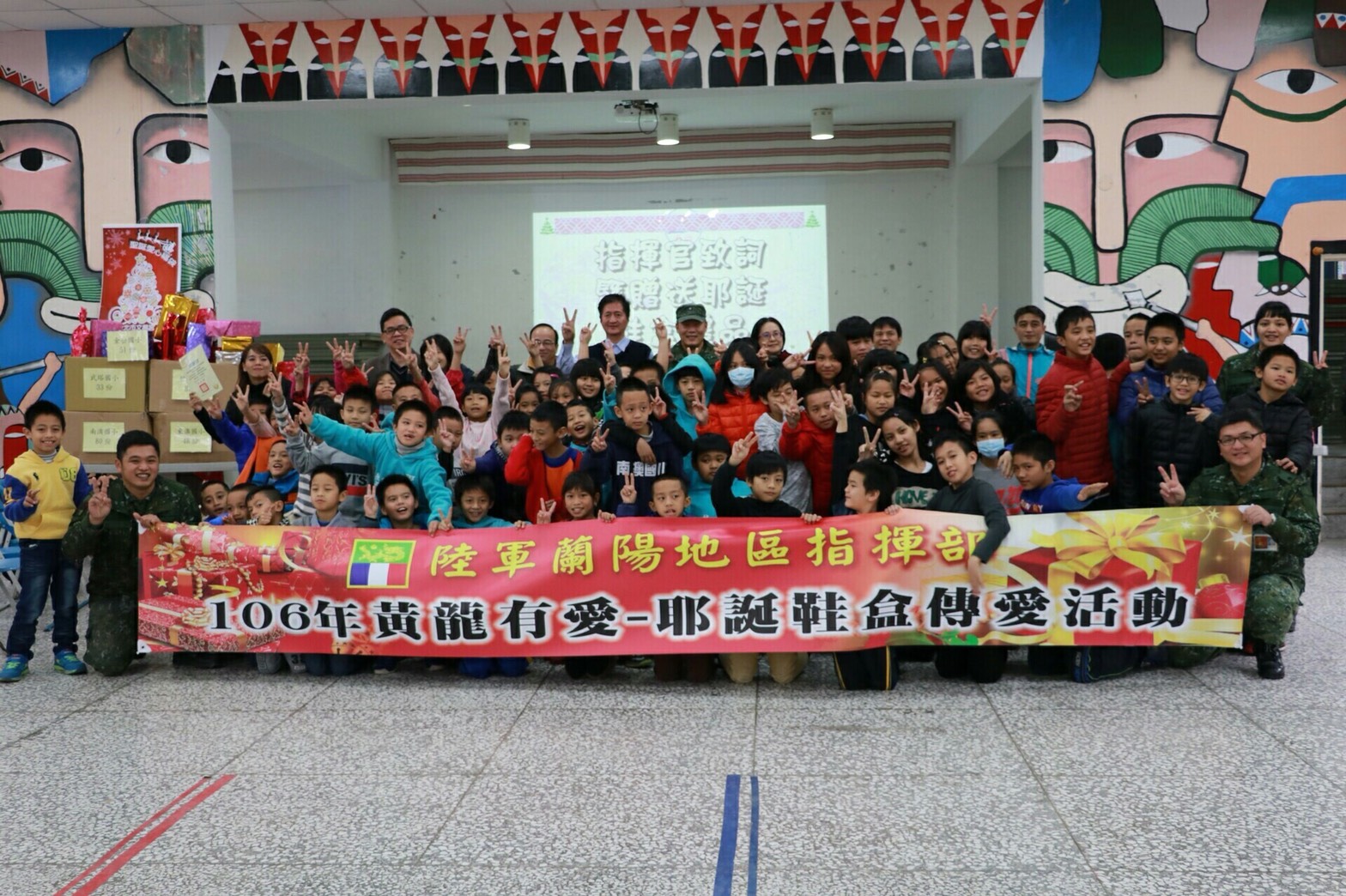 陸軍蘭陽地區指揮部黃龍有愛耶誕鞋盒傳愛活動啟程至南澳國小。(照片/蘭陽指揮部提供)