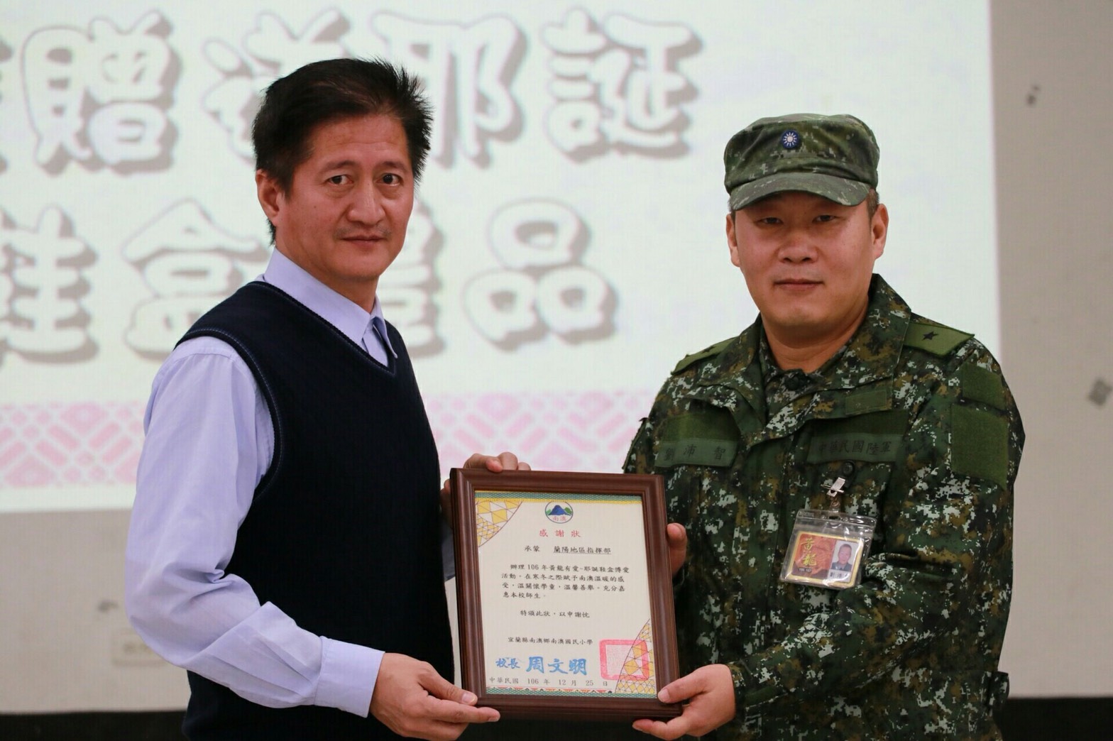 南澳國小校長周文明致贈感謝狀給劉沛智指揮官。(照片/蘭陽指揮部提供)