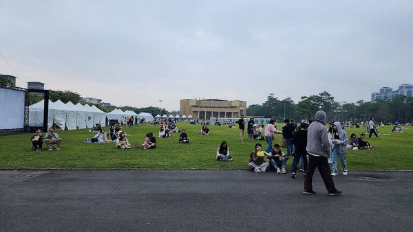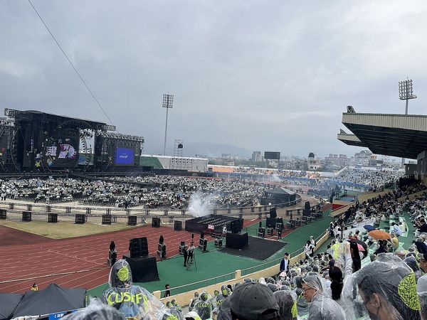 演唱會今天 傍晚17時開場,由於下午天氣很 好,草坪上也有許多人席地而坐,免費接駁車也不時穿梭,靠近田徑場周邊的人行道也塞滿了各式機車、腳踏車。