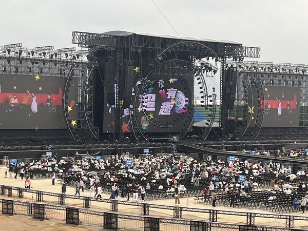 場內音樂響起,夾雜著高空煙火,大銀幕也開啟了歌星的身影,節目炫麗登場,接近尾聲的時候,雨勢變大,有些觀眾開始離席而去…。