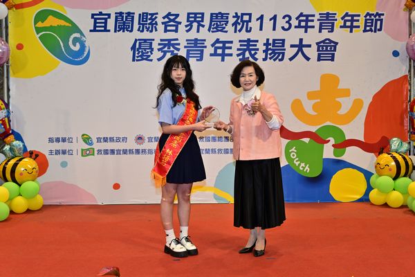 國中優秀青年26位:宜蘭國民中學潘妍聿、復興國民中學陳芊秀、中華國民中學賴玄晉、凱旋國民中學陳廷榿、羅東國民中學林楷翊、國華國民中學鍾云廷、東光國民中學陳冠州、蘇澳國民中學曾品叡、文化國民中學蕭奕廷、南安國民中學池允宸、頭城國民中學林冠丞、礁溪國民中學林勃宏、吳沙國民中學何雨蓁、壯圍國民中學張佑翔、員山國民中學陳仕軒、內城中小學(國中部)鍾家樂、五結國民中學許哲郡、興中國民中學曹予樂、利澤國民中學張芹螢、順安國民中學賴靖宇、冬山國民中學陳又瑜、三星國民中學吳可人、大同國民中學姜庭恩、南澳高中(國中部)林紹恩、慧燈高中(國中部)林承諹、中道高中(國中部)吳孟穜。
