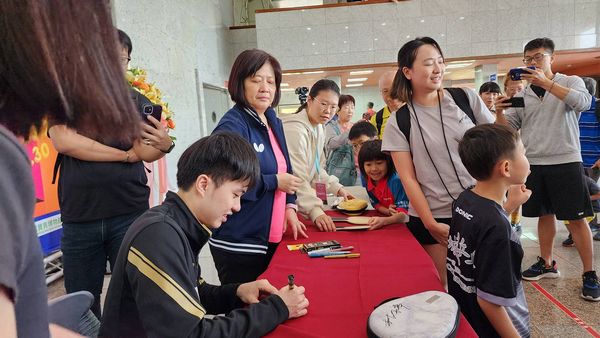 早上開幕典禮林昀儒進場時,小選手們一看到他,立即發出尖叫聲,典禮結束時,前面的小朋友立即攀爬上講台,要與林昀儒握手。早上等候林昀 儒簽名的人,更是從室內排到室外,簽名的道具五花八門,有的拿桌球、有的拿球拍、有的拿球拍套、也有用白紙的、有的彎著身子,要求寫在衣服上。林昀 儒也準備了黑色、金色、銀色等色筆。