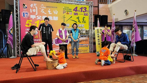 孝親尊師聯盟並將於4月13日舉辦「千人走春」活動,由孩子 著父母一起慢走,為「甲父母洗腳」暖身。今天在縣府大廳舉行記者會,並由兩位小朋友為其父母洗腳,作為示範。