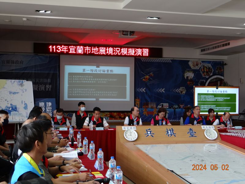 今日演練,以宜蘭市發生地震規模7.1 強震為情境想定,並由公所第一時間應變,分為災害應變中心及前進指揮所2組,於不同場地面臨不同的狀況,於地震發生後第一階段0到6小時包含「人命搜救」、「緊急醫療」、「民眾照護」及「生命維持」等議題,透過討論引導參演者提出應變處置方案,包含災情查通報、資源人力及任務安排、彙整大量災情、救災工作執行及物資人力增援等。
