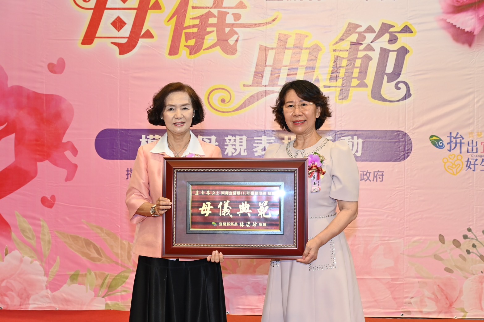 經由公所、民間團體推薦,共遴選出宜蘭縣14位模範母親分別為~林曾秀琴女士、葉吳雪花女士、尹李阿花女士、朱繍女士、盧素芬女士、吳梅玉女士、陳林阿桃女士、游金蓮女士、簡林美子女士、黃阿英女士、李游美玉女士、麥福金女士、林靜慧女士及鄧阿緞女士等,在家人陪同下出席接受表揚。在這次榮獲表揚的模範母親們,不僅是家庭的支柱,也是社區的榜樣,她們以自己的言行舉止影響著周遭的人,成為社會上的模範。