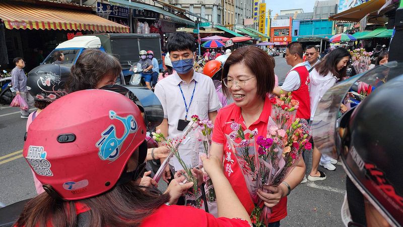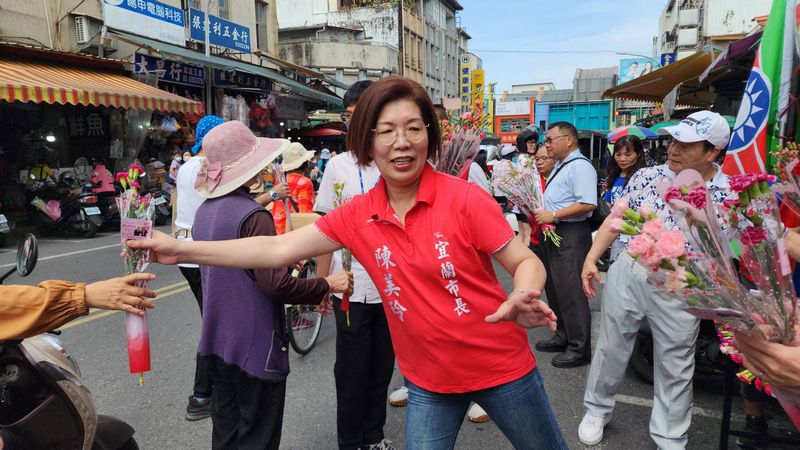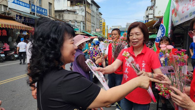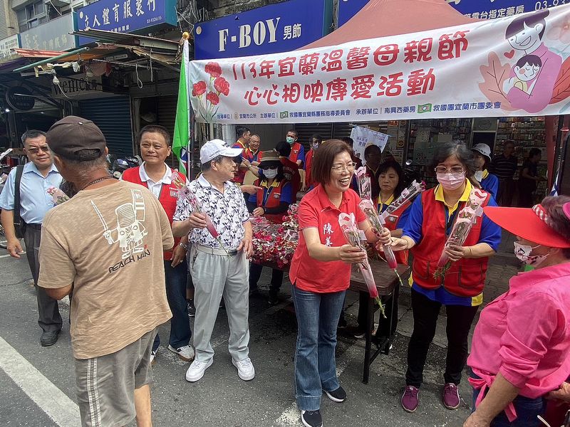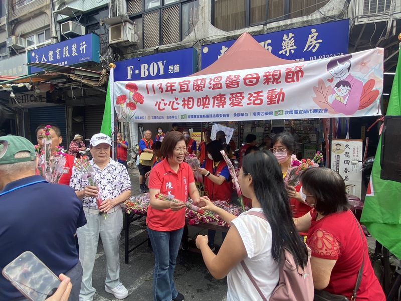 愛在五月天,宜蘭市南北館市場街頭鬧區12日上午出現溫馨的畫面,為慶祝一年一度的母親節,宜蘭市長陳美玲和由主委許財清等,上午九時起即在光復路南興西藥房門口,聯袂贈送千朵康乃馨給民眾,祝福所有媽媽們母親節快樂,場面相當熱烈溫馨。