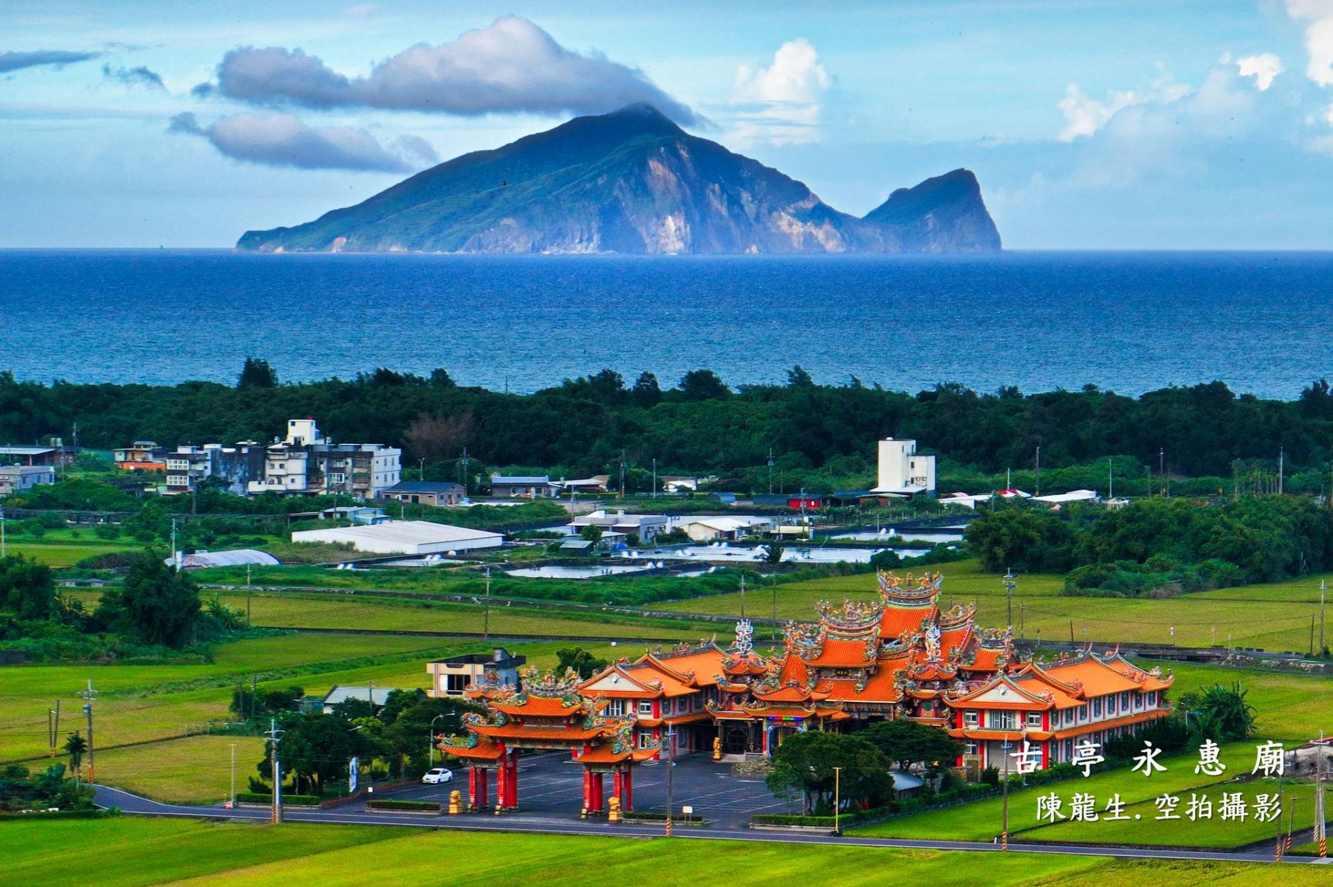 壯圍鄉古亭村永惠廟(牛埔仔廟)。照片上寫著~「古亭永惠廟.陳龍生.空拍攝影」。