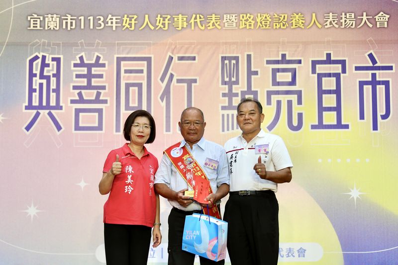 宜蘭市長陳美玲表示,感謝每一位受獎人的善行義舉,展現了對社會的高度關懷與溫暖的傳遞,默默行善的好人好事代表,長期在各領域付出與貢獻,希望透過他們的善行事蹟,以微光點亮微光,帶動更多善心人士與善同行,提升正向的社會力量;許多路燈認養人多年來持續認捐,也鼓勵及號召更多民眾加入,為夜歸的市民點亮平安回家的路,持續照亮和諧、幸福的宜蘭市。