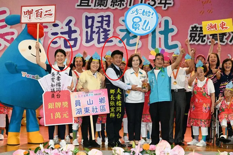 縣長林姿妙頒獎給~員山鄉「湖東社區呷百二隊」時,員山鄉長張宜樺,和員山鄉縣議員黃雯如,夫妻檔同時和表演團隊站上台上,,特別引人注目。