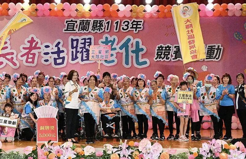 縣府辦理「長者活躍老化競賽」活動,邀請縣內12鄉鎮市65歲以上長者,組隊舞出健康與活力,參與的長輩中以員山鄉湖東社區的簡阿露阿公96歲最高齡;看到阿公阿嬤們的熱情參與,也讓這項活動更具意義。各鄉鎮市共推派12隊代表隊,在活動前2~3個月長輩們就努力反覆練習,不僅獲得65歲以上長者的熱烈迴響,超過90歲的耆老也高達17位,甚至還有許多坐著輪椅活力滿滿的長輩來響應,這種衝勁令人感佩!