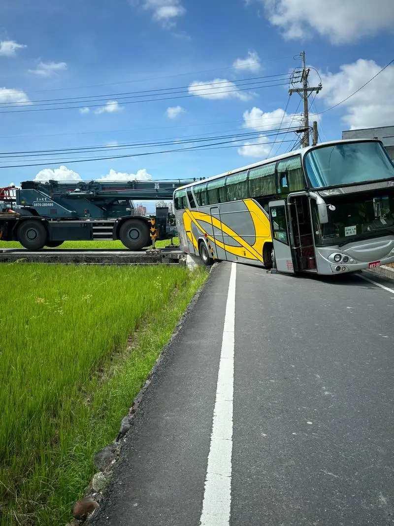 宜蘭分局表示,今(21)日早上9時許,在宜蘭市中山路五段495巷與茭白路口發生一起交通事故,有1輛遊覽車沿中山路五段495巷東往西向行駛,至前述路口右轉茭白路時,右後車輪不慎陷落路旁稻田,所幸全車連同駕駛共42人均未受傷,警方到場對駕駛實施吐氣酒測,沒有酒精反應,詳細的肇事原因仍待後續調查釐清。