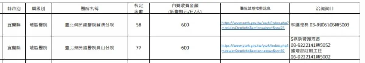 地區醫院2家~★台北榮總蘇澳分院有58病床及★台北榮總員山分院有77病床;自費收費金額均為600元;聯繫電話:*蘇澳林護理長03-9905106轉5003,*員山病房黄護護理長03-9222141@5052、*理部旺副主任03-9222141轉5002