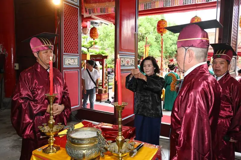 宜蘭縣各界紀念「大成至聖先師孔子2574年誕辰典禮」,今(113)年9月28日(星期六)上午6時20分於宜蘭縣孔廟舉行,在國立宜蘭高商國樂社悠揚古樂、與力行國小唱生及六佾舞中,依照古禮進行,典禮結束=力縣長並在現場分發「智慧糕」給參加的民眾。