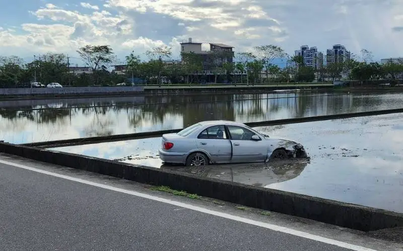 好厲害的一輛小轎車,居然橫跨過水圳,落在田中央。