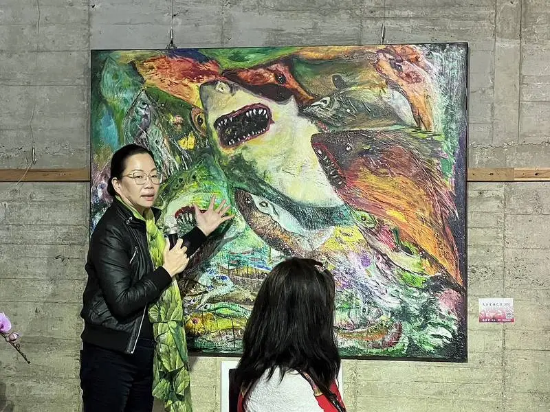 中華畫會美術協會第五屆理事長鄭娟娟說,我發現在林碧雲的內心裡,大鯊魚流露出驚慌的恐懼,在擁擠中掙札的小魚,紅色綠色的展現出來的張力,真的是讓我嚇到了,海裡的汙染,讓大地的母親正在哭泣,大海己經容不下牠們。