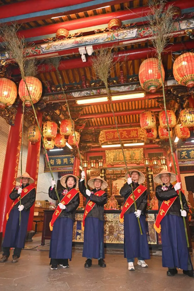 接著開始進行筅黗的重要儀式,由正獻宮及左右獻官戴上斗笠,拿著竹筅、掃帚清理神殿,以古禮為眾神尊整理衣冠,將神座身上灰塵清理乾淨,再到香爐前,用篩子將香灰除去雜質,並鋪上新的香灰,讓廟宇煥然一新。這一過程不僅象徵著對神明的敬意,也傳遞了除舊佈新的美好寓意,提醒民眾準備迎接新年的到來。