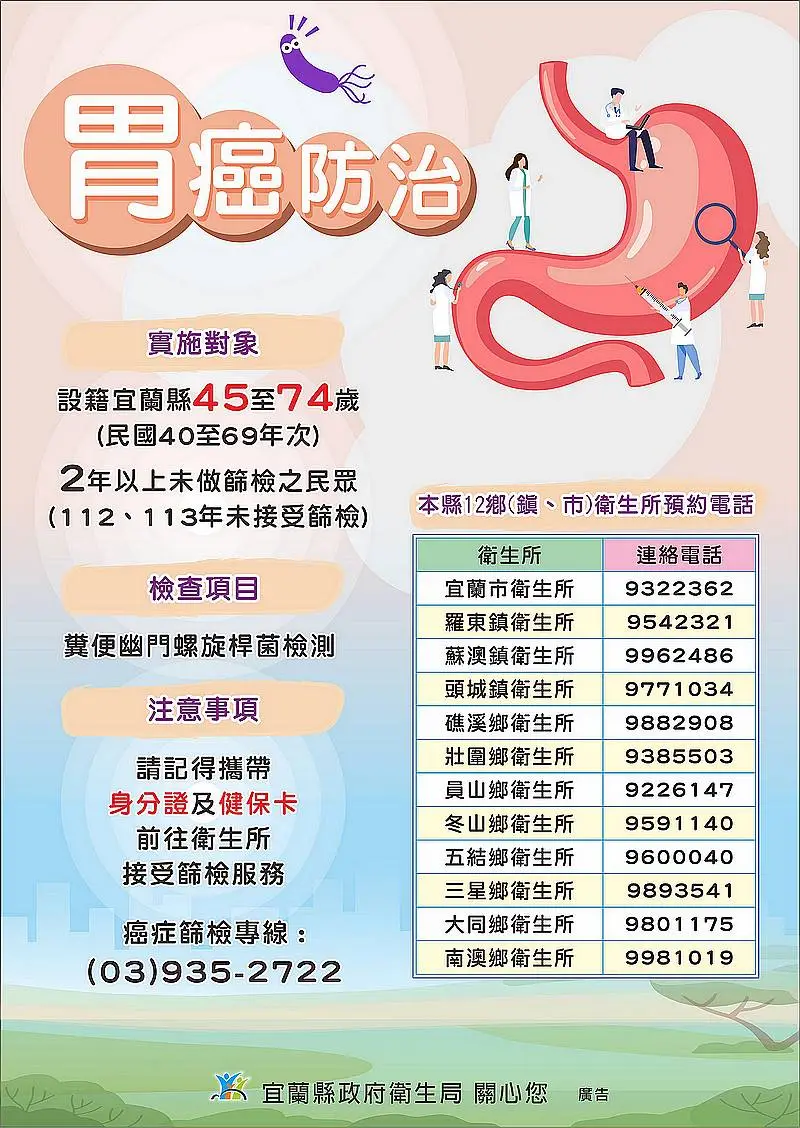 徐局長表示,依據國民健康署最新癌症登記資料顯示,胃癌位居宜蘭縣10大癌症發生率第8名,一年新診斷胃癌人數有108人;另依衛生福利部最新國人死因統計結果,胃癌位居且本縣10大癌症死亡率第4名,一年因胃癌死亡人數有81人。導致胃癌發生的原因,大致上與環境、飲食、免疫、胃幽門螺旋桿菌感染及慢性胃病有關。