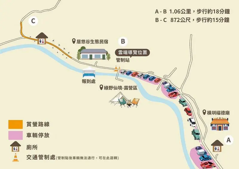 為了兼顧生態旅遊,訂定活動期間交通管制,時間為4月1日至5月31日,每日下午16:00-20:00的4小時進行管制,管制路段從匏杓崙路137-3號至小礁溪橋(小礁溪一號橋上方約300公尺以上路段),屆時請用路人配合。
