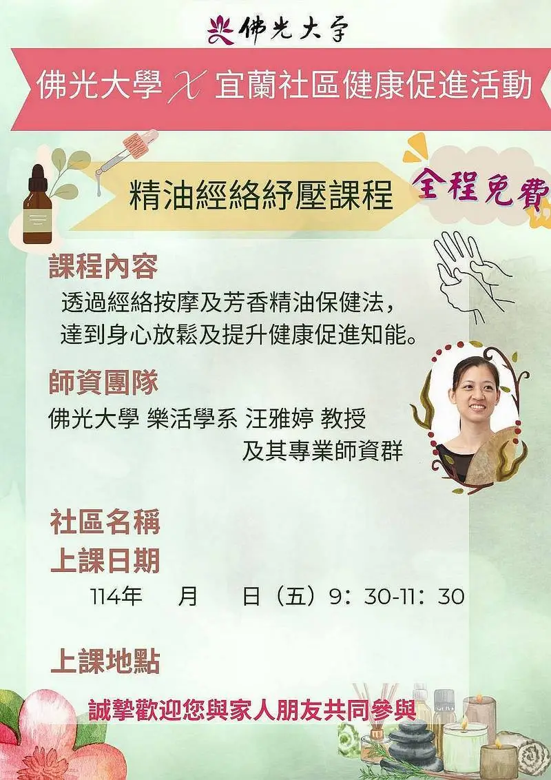 陳里長表示,七張社區另外還有『精油經絡紓壓』課程,也是由佛光大學 樂活學系 汪雅婷教授及其專業師資群負責教導,也是全程免費,場次如下~