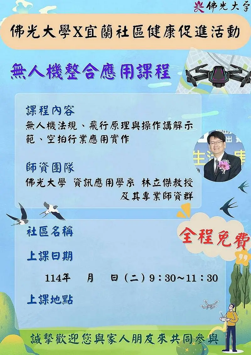 陳里長說,七張社區的『無人機體驗』課程,由佛光大學教師資訊應用學系林立傑教授和其專業師資群負責。共有三場次~