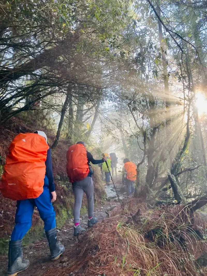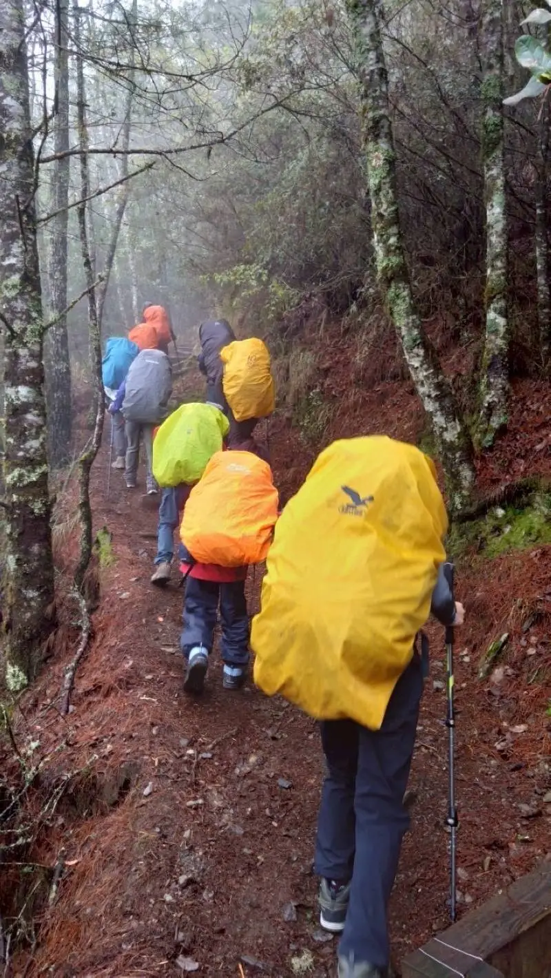 在這次三天兩夜的雪山行程中,師生們連續兩個晚上都住在七卡山莊。第一天上午,他們花了許多時間轉乘公共交通工具,直到下午才終於開始步行。孩子們既輕鬆又緊張,每個人都背著裝滿這幾天所需物品的背包,平均重量約10到11公斤。