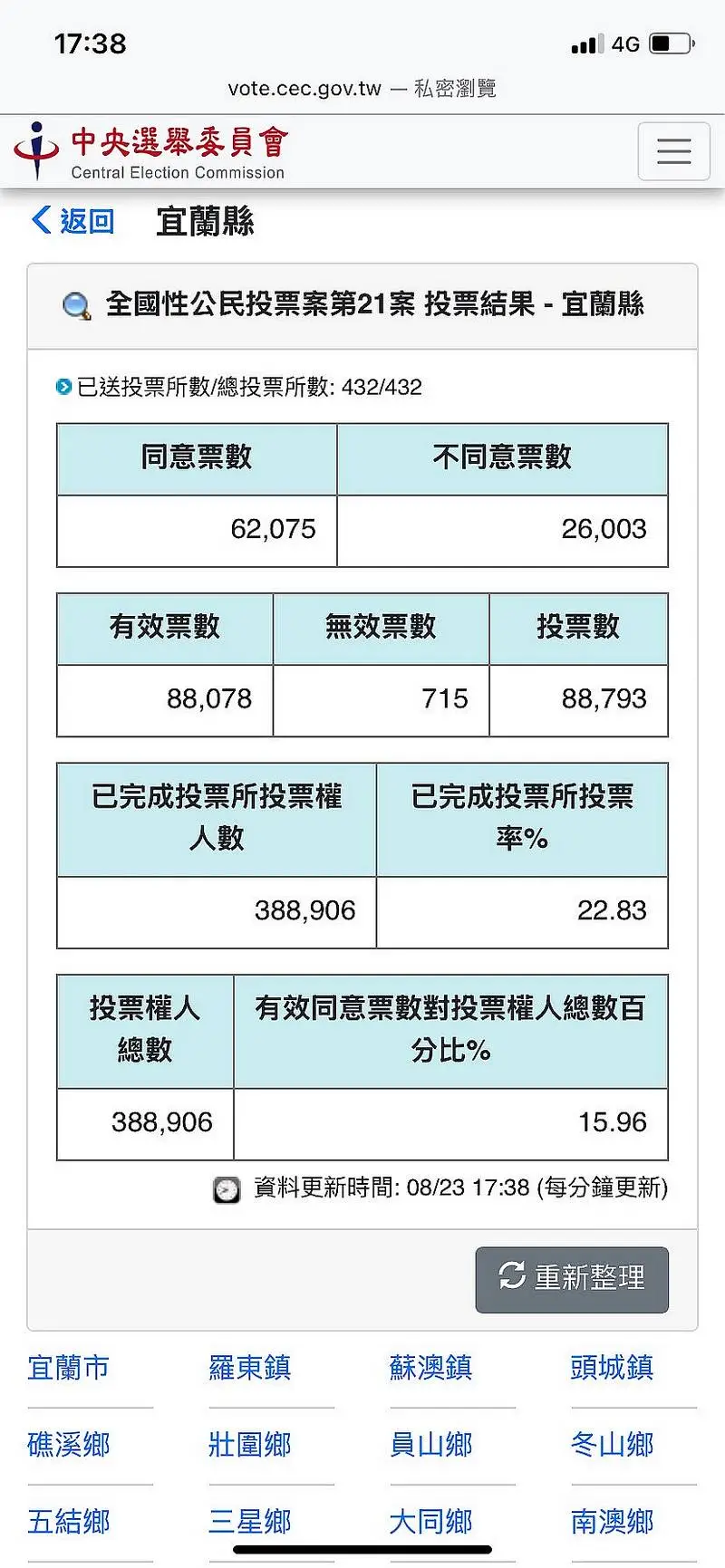 縣選舉委員會表示,中央選舉委員會將於8月29日發布第21案全國性公民投票結果公告,屆時將以中選會公告為準。
