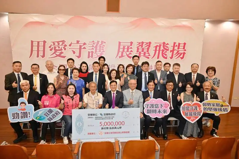「用愛守護‧展翼飛揚」!全國台灣同胞投資企業聯誼會(台企聯)今(3)日捐贈500萬元予宜蘭縣政府,用於協助弱勢家庭脫困與社會福利推動。儀式於宜蘭縣議會簡報室舉行,由會長李政宏率領30名幹部親自到場,縣長代理人林茂盛代表受贈並回贈感謝狀。