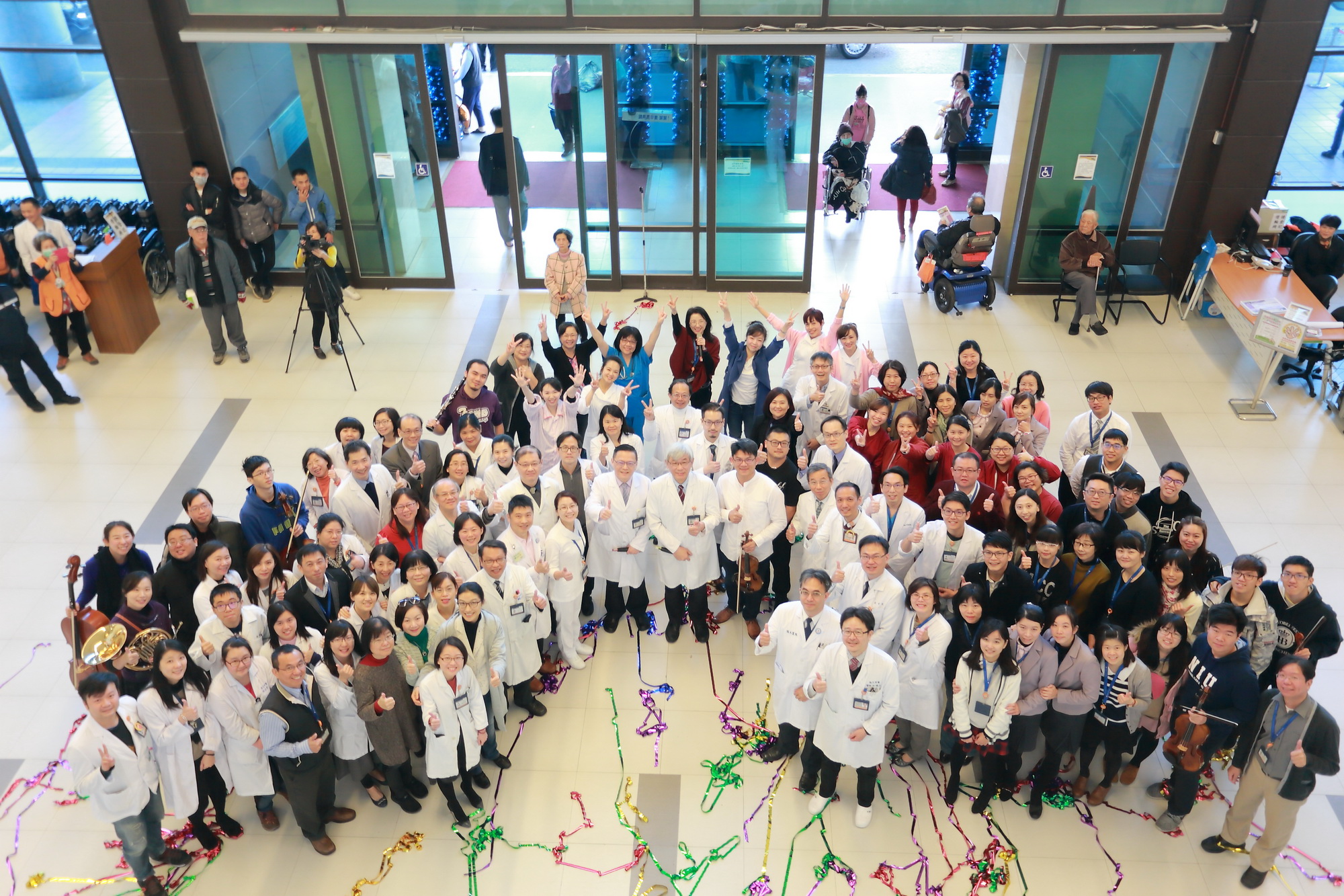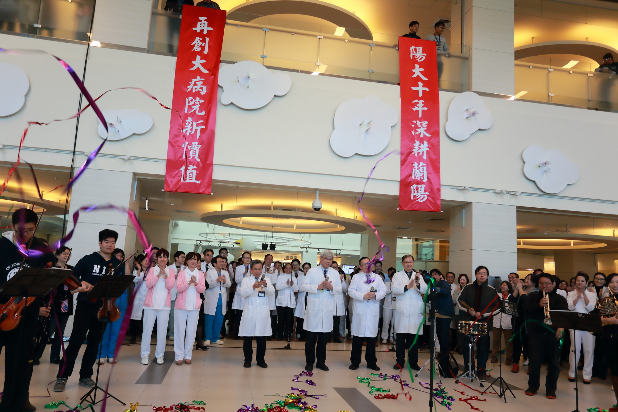 國立陽明大學附設醫院改制10週年了!為了慶祝改制10週年,陽大醫院於1/15-1/20舉辦一系列慶祝活動,並於今(15)日上午10時30分,院長羅世薰率領醫療副院長王緯書、行政副院長張克昌、醫療及行政團隊,讓白色巨塔呈現不一樣的面貌,以悠揚旋律、活潑輕俏方式在蘭陽院區一樓大廳閃動登場。