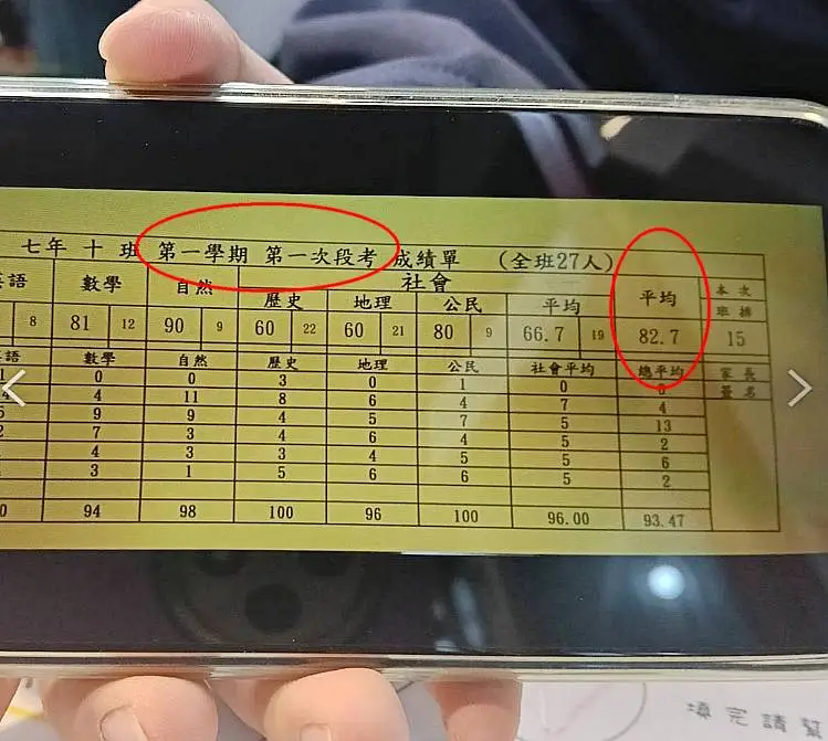 上圖/這位同學用手機拍了他的第一次段考成績,平均82.7分, 點了一碗價格40元的肉燥乾麵,老闆娘打折後只算他30元,還加送一粒滷蛋。表單的底部